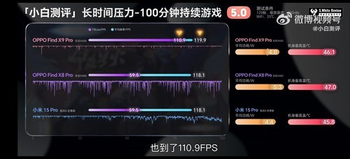 不仅单款游戏帧率表现稳定,OPPOFindX9Pro在连续游玩100分钟《王者荣耀》的压力测试中平均帧率仍维持在110.9fps,最高机身温度为46.1℃。